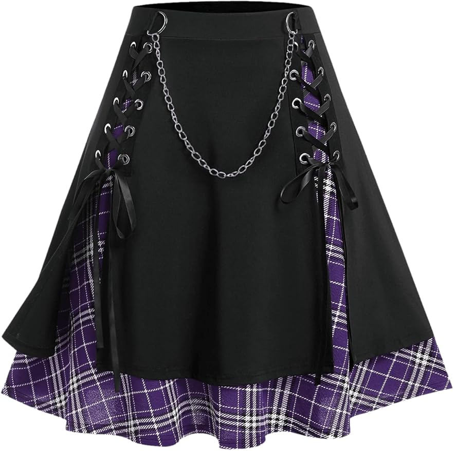 Women's Plus Size Mini A-Line Gothic Skirt Casual Plain Chain Detail High Waisted Short Stitching Plaid Pleated