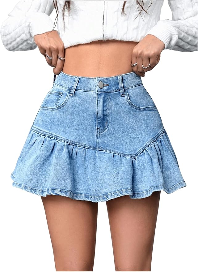 Women's Ruffle Hem Pleated Jean Skirt High Waist Y2K A Line Flared Denim Skirt