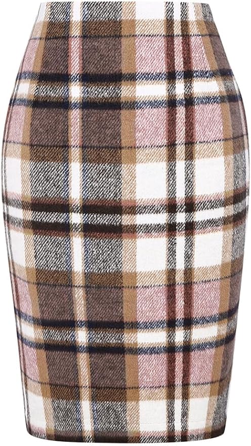 Womens Wool Plaid Pencil Skirt Fall Winter High Waisted Slit Bodycon Knee Length Midi Skirt