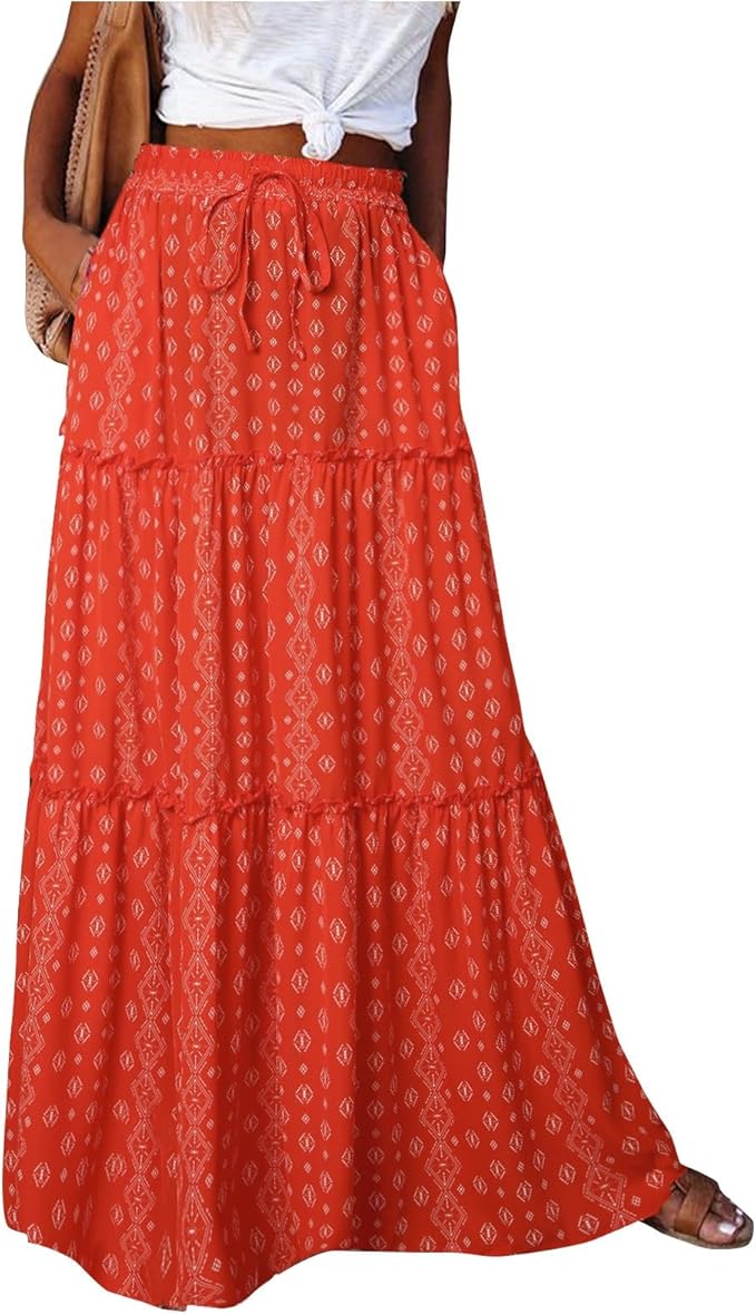 Pleated Long Skirts for Women Summer Casual Elastic High Waisted Skirts A-Line Flowy Swing Maxi Skirt with Pockets