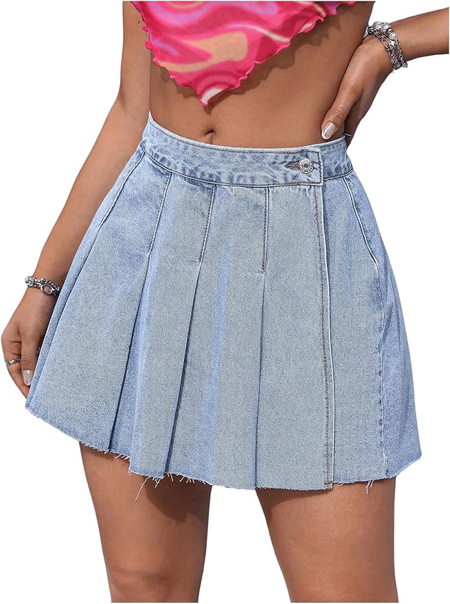 Women's Raw Hem Pleated Denim Skirt Button Front Drop Waist Short Jean Skirts
